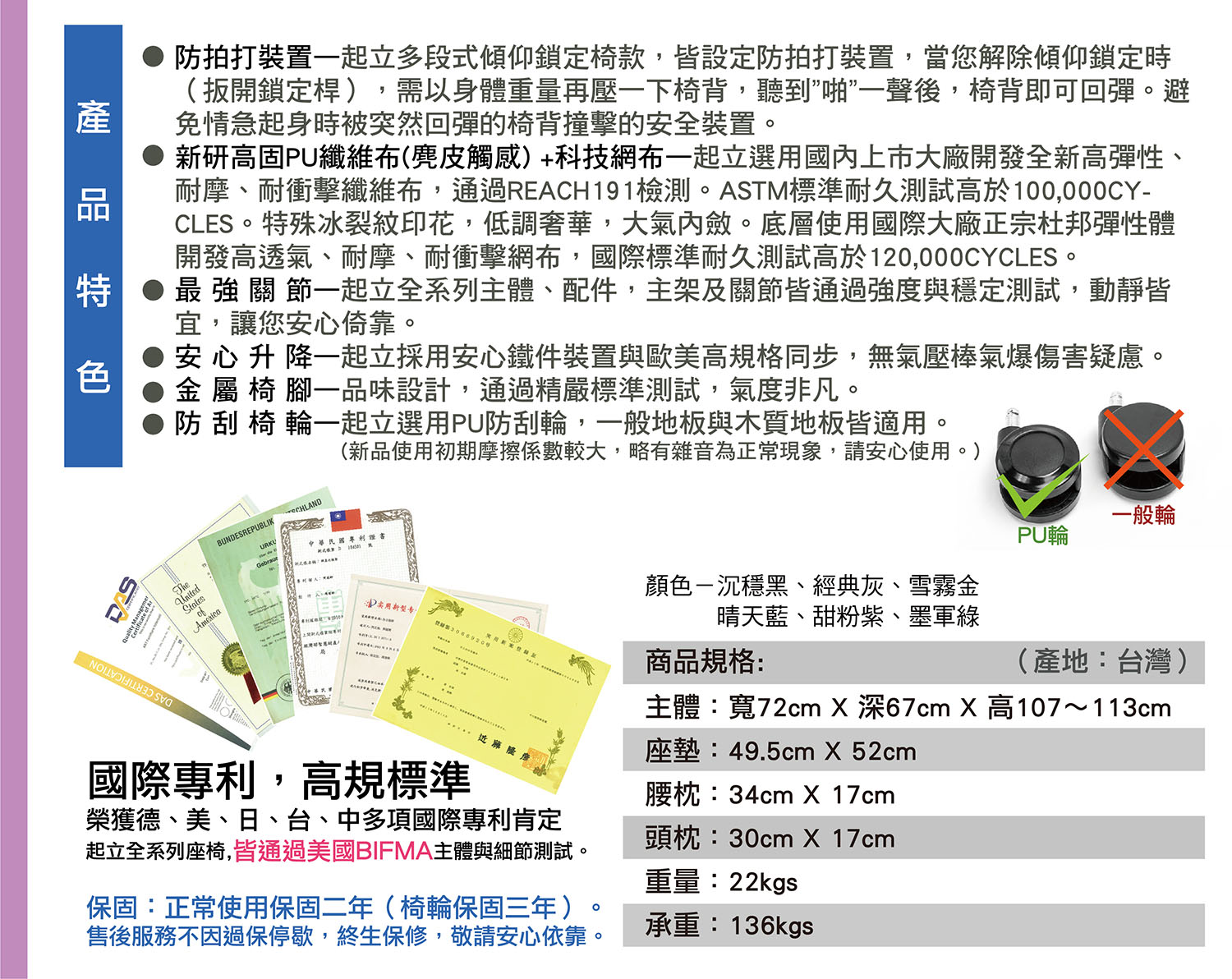 起立精選PU防刮輪,一般地板與木質地板皆適用。