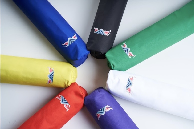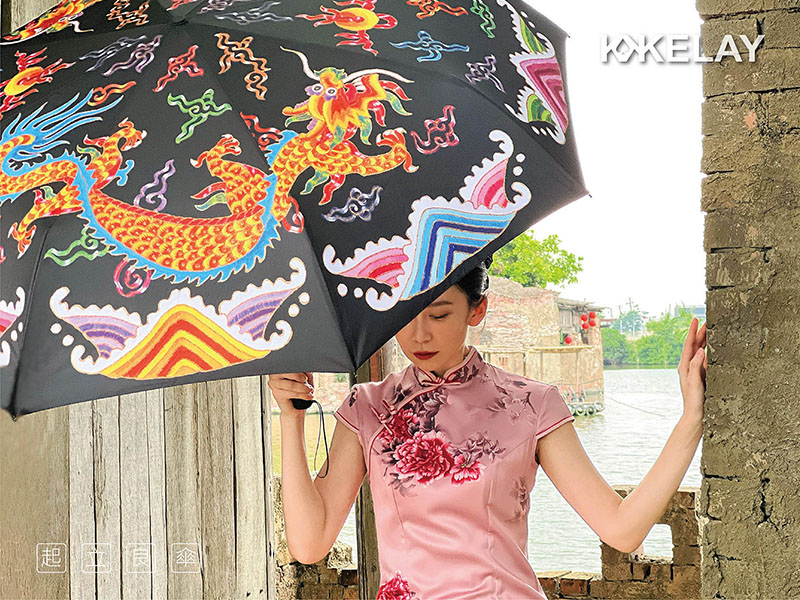將原用於神明出巡、進香時的華蓋涼傘,稍作變化為日常可用,保留了傳統刺繡的巧思,讓祥獸躍然傘上。研發本意是讓香擔的護持更安穩隆重精神奕奕,但老師傅的繡圖加上飽滿的色彩底蘊,讓看過的人都愛不釋手。索性量產,開傘點燈。