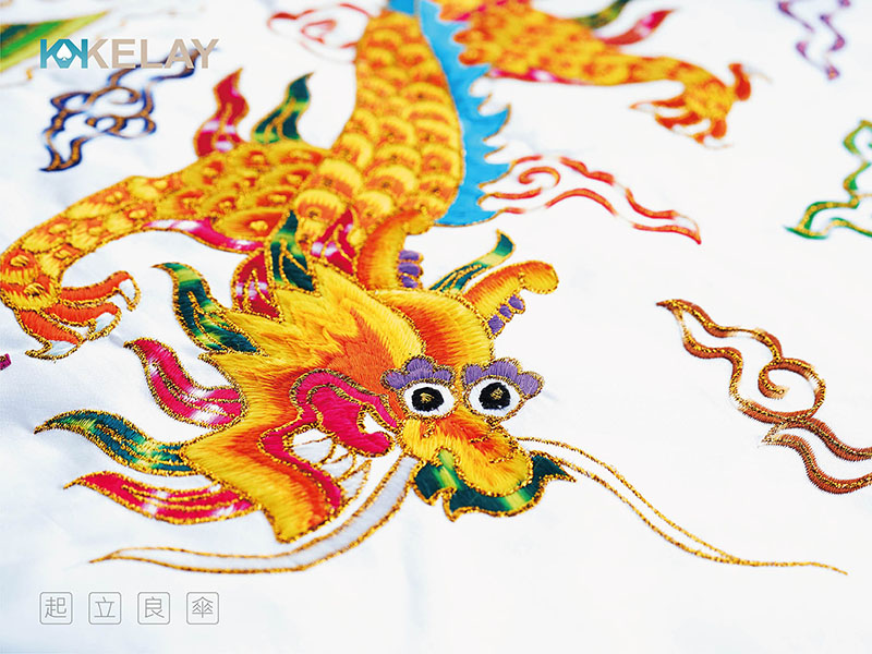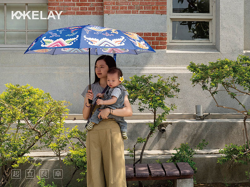 將原用於神明出巡、進香時的華蓋涼傘,稍作變化為日常可用,保留了傳統刺繡的巧思,讓祥獸躍然傘上。研發本意是讓香擔的護持更安穩隆重精神奕奕,但老師傅的繡圖加上飽滿的色彩底蘊,讓看過的人都愛不釋手。索性量產,開傘點燈。