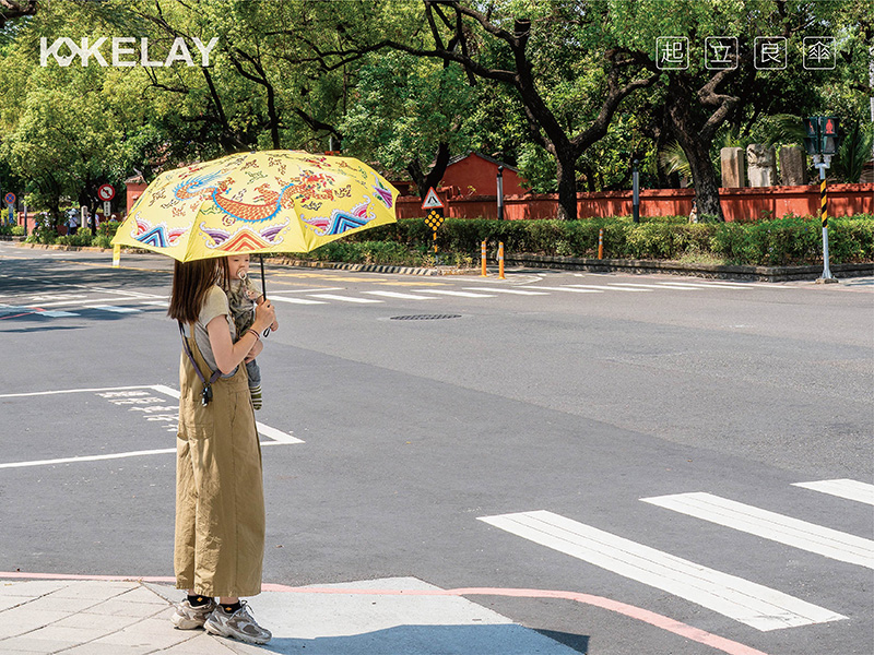 將原用於神明出巡、進香時的華蓋涼傘,稍作變化為日常可用,保留了傳統刺繡的巧思,讓祥獸躍然傘上。研發本意是讓香擔的護持更安穩隆重精神奕奕,但老師傅的繡圖加上飽滿的色彩底蘊,讓看過的人都愛不釋手。索性量產,開傘點燈。