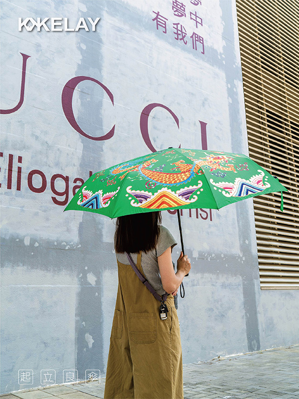 將原用於神明出巡、進香時的華蓋涼傘,稍作變化為日常可用,保留了傳統刺繡的巧思,讓祥獸躍然傘上。研發本意是讓香擔的護持更安穩隆重精神奕奕,但老師傅的繡圖加上飽滿的色彩底蘊,讓看過的人都愛不釋手。索性量產,開傘點燈。