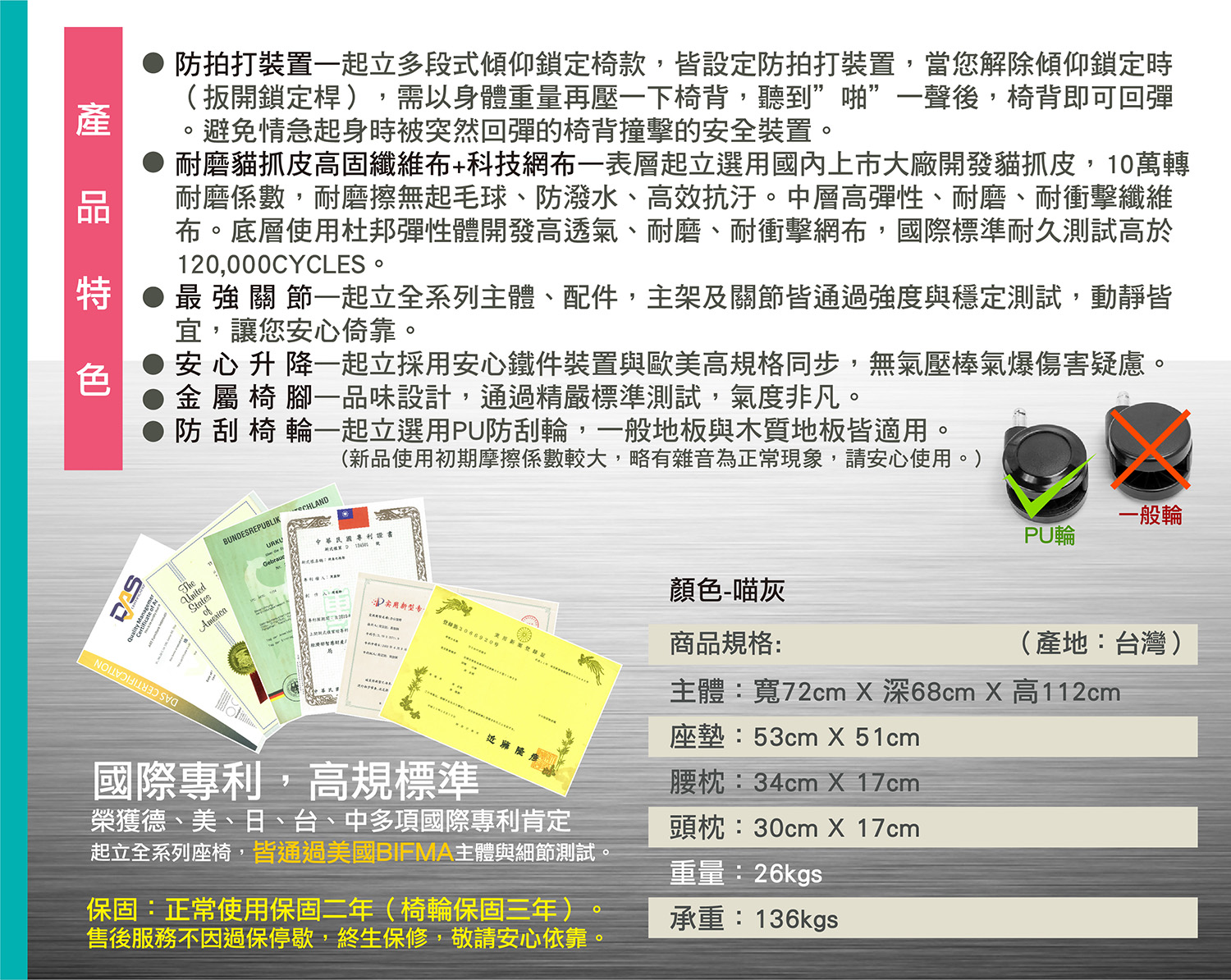 國際專利,高規標準—起立布材與主體細節通過ASTM與BIFMA標準測試。並榮獲德、美、日、台、中……多項國際專利肯定。