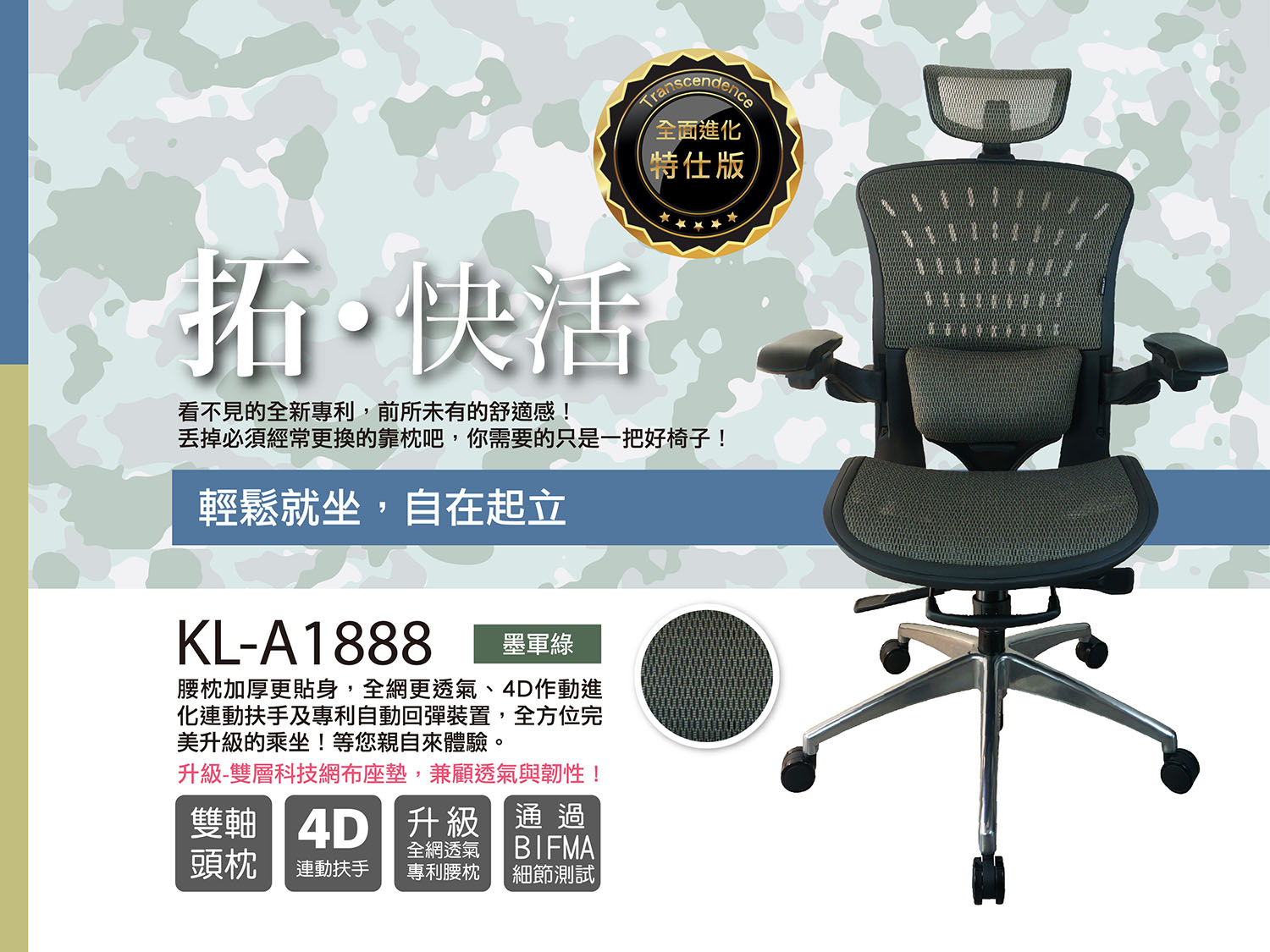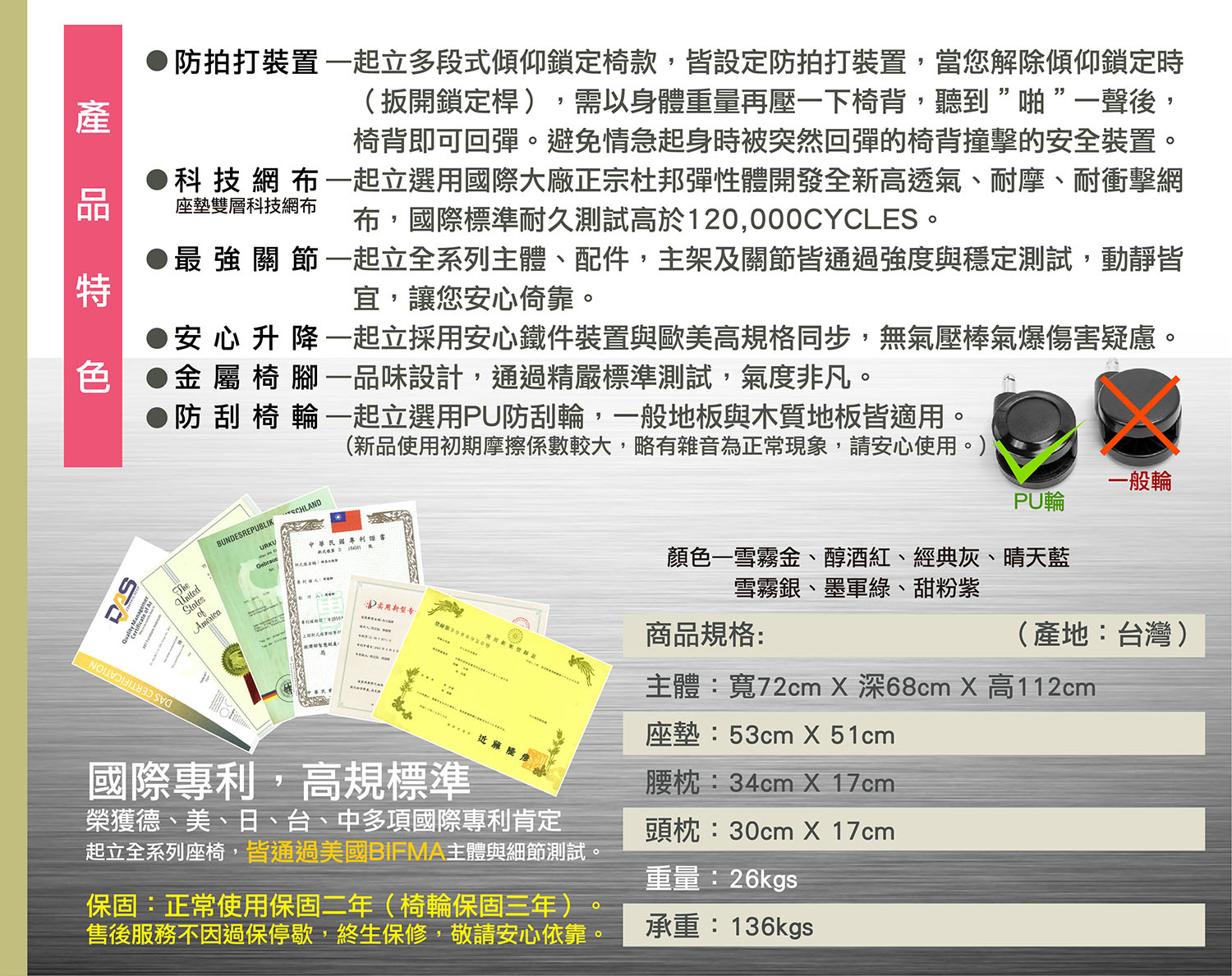 國際專利,高規標準—起立全系列座椅,皆通過美國BIFMA主體與細節測試,並榮獲德、美、日、台、中……多項國際專利肯定。